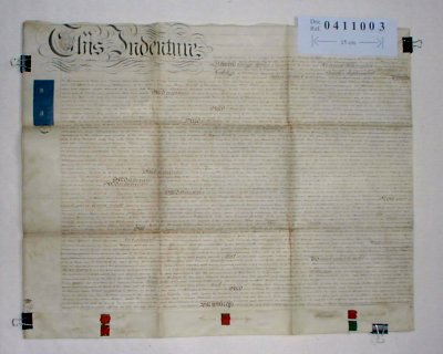 | Parchment : 1 sheet 60cm x 78cm with 3 wax seals, revenue stamps and plan on reverse. | ||||||||||||
