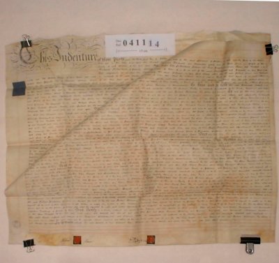 | Parchment : 2 sheets 91cm x 63 cm with 2 wax seals and revenue stamps. | |||||||||||