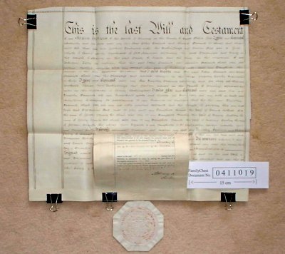 | Parchment copy of will consisting of 1 sheet 43cm x 48cm, together with grant of probate and embossed pendant seal. | |||||||||||||