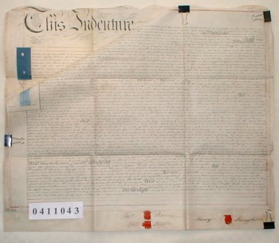 | Parchment : large indenture of 2 sheets 62cm x 76cm with 3 wax seals and small plan in margin. Embossed stamp. Very small plan of property on front sheet. | |||||||||||||