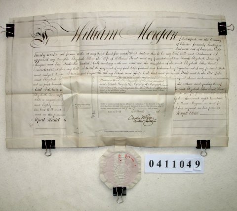 | Parchment : Copy of will on 1 sheet 32cm x 55cm with grant of probate on a separate sheet with pendant seal. | ||||||||||||