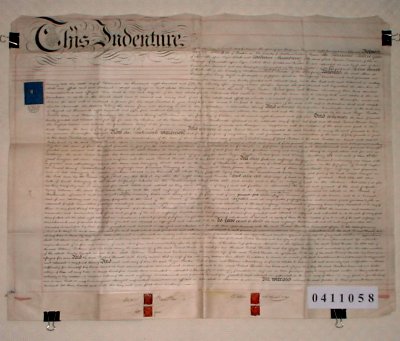 | Parchment : 1 sheet 63cm x 79cm with 3 wax seals, signatures and revenue stamp. | ||||||||||||||