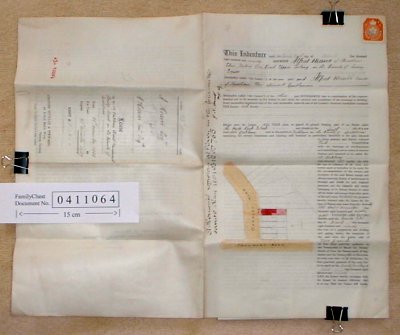 | Parchment : 2 sheets 44cm x 27cm with 1 wax seal and duty stamp. Typed with manuscript insertions. Includes small plan of property. | ||||||||||||