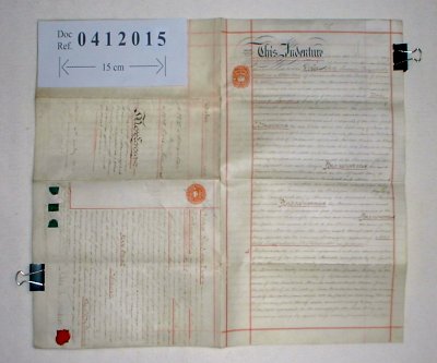 | Parchment : 2 sheets 26cm x 40cm with 3 seals and duty stamps. Includes a second indenture of 04/07/1912 written on the back. | |||||||||||