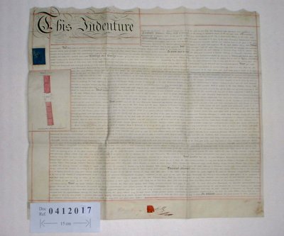 | Parchment : 1 sheet 60cm x 72cm with wax seal, duty stamp and plan of property in margin. | |||||||||||