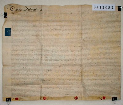 | Parchment : 1 sheet 69cm x 50cm with 4 wax seals and revenue stamps. | ||||||||||||