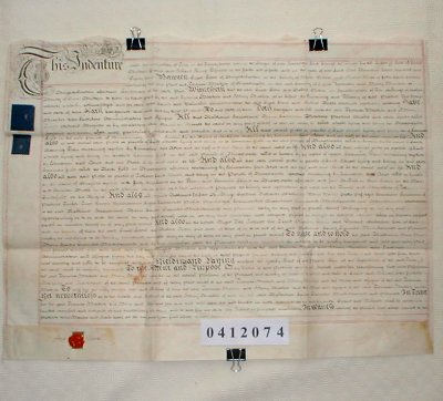 | Parchment : 1 sheet 72cm x 55cm with 1 wax seal and revenue stamp. Signed by Grace Geere. | ||||||||||||