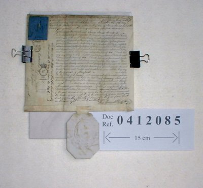 | Parchment : 1 sheet 19cm x 21cm with pendant embossed seal and duty stamp. | ||||||||||||