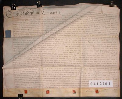 | Parchment : 3 sheets 68cm x 58cm with 4 wax seals signatures and revenue stamps. | |||||||||||