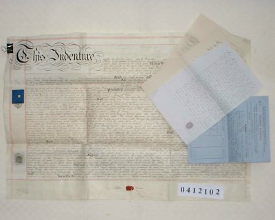 | Parchment : 1 page 78cm x 55cm with 4 attached signed receipts. Wax seal and revenue stamp. Second Indenture on back page dated 27/11/1868 with second wax seal. | ||||||||||||