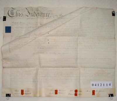 | Parchment : 3 sheets 63cm x 78cm with 8 wax seals signatures and revenue stamps. | ||||||||||||