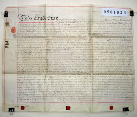 | Parchment : 1 sheet 59cm x 72cm with 3 wax seals, 1 signature and revenue stamp. A second Indenture of 2 July 1886 has been added on the back. | ||||||||||||