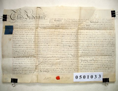 | Parchment : 1 sheet 56cm x 37cm 1 red wax seal and revenue stamp. Signed by Anthony Buddry. | |||||||||||