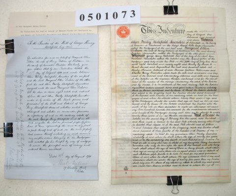 Alan Morley Wakefield SAUNDERS of Silverdale, Lancashire. Lieutenant in Kings Royal Rifle Corps. Margaret Ellen DOBSON the wife of Henry DOBSON of Kirkham, Lancashire. Butcher. George Henry WAKEFIELD (deceased) of Liverpool, Lancashire. Corn Merchant. SUBJECT The document begins by reciting the Will of George Wakefield who died in 1903 leaving property to his grandson Alan Morley Wakefield Saunders, the only son of Mary Constance Saunders. Alan Saunders is now mortgaging some or all of that property to Margaret Dobson for £335. One of the attached letters is to inform George Wakefield's Trustees of this mortgage. The other two letters relate to other loans to Alan Saunders secured on the same property. | ||||||||||||