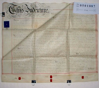 | Parchment : 2 sheets 63cm x 74cm with 4 wax seals and revenue stamp. | |||||||||||||