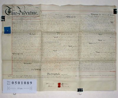 | Parchment : 1 sheet 55cm x 72cm with 2 wax seals and revenue stamp | |||||||||||||