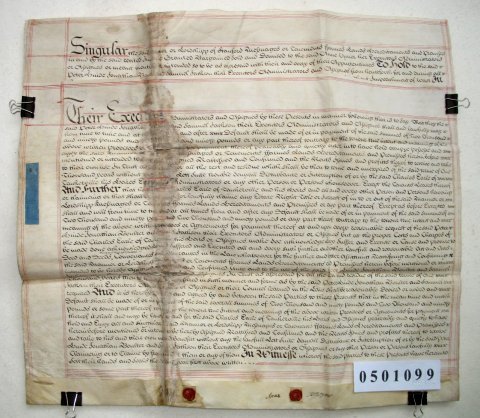 | Parchment : 4 sheets 61cm x 70cm with 2 wax seals, 2 signatures and revenue stamps. A separate Deed of 1738 with a further 4 seals / signatures has been added on the back of one sheet. | ||||||||||||