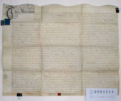 | Parchment : 1 sheet 61cm x 76 cm with wax seal and revenue stamps. | ||||||||||||