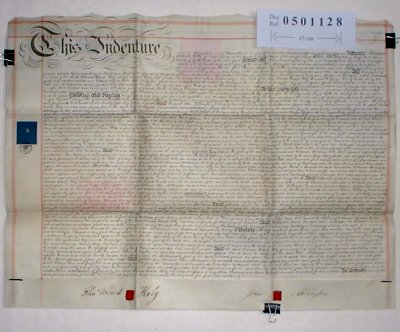 Thomas Beard Holy of Norton House, Derbyshire. Esquire. John Millington of Sheffield, Yorkshire. Hatter. SUBJECT Thomas Beard gives a lease for 800 year to John Millington at a rent of £18/10/0d per annum. The property totals 1235 square yards and is on the corner of Porter Street and Wilkinson Street. John Millington undertakes to build 3 good and substantial houses of 2 stories on the plot. NB. See also document reference 0501127 which appears to be identical. Document 0501127 contains some minor corrections and insertions, whereas 0501128 is the 'good' copy. Both are signed, sealed and stamped, so they both appear to be valid contracts. It is quite common to find a Lease and identical Counterpart Lease, so that is probably the case here, although neither are actually marked 'Counterpart'. | |||||||||||