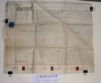 | Parchment : 2 sheets 55cm x 67cm with 3 wax seals and duty stamps. (Includes a copy of a related letter). | |||||||||||||