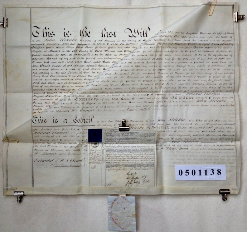 | Parchment : 2 sheets copy of Will 68cm x 55cm with attached Probate and pendant seal. | |||||||||||