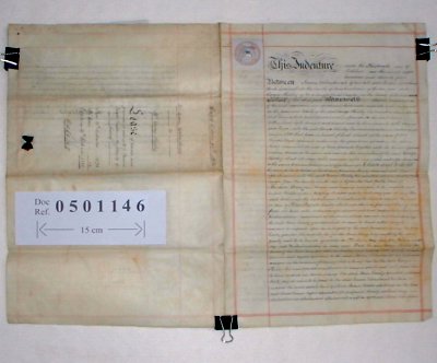 | Parchment : 2 sheets 45cm x 30cm with wax seal, revenue stamp and plan of the property.