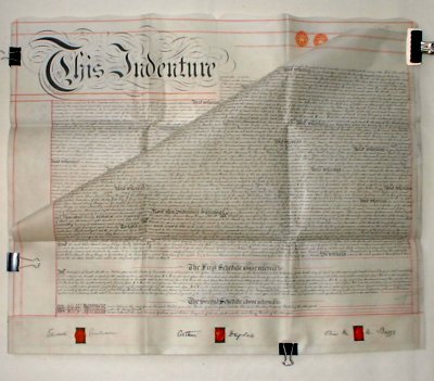 | Parchment : 2 sheets 59cm x 72cm with 3 wax seals and revenue stamps. | |||||||||||||