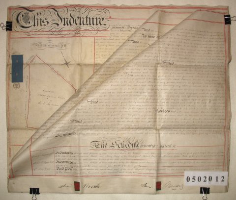 | Parchment : 3 sheets 61cm x 74cm with 2 wax seals, 2 signatues and revenue stamps. Includes a plan of the property on the firrst sheet. | |||||||||||||