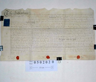 | Parchment : 1 sheet 34cm x 62cm with 3 wax seals and escutcheoned revenue stamp. | |||||||||||||