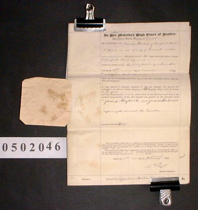 | Paper parchment : 25cm x 35cm. Manuscript copy of will together with printed grant of probate and embossed pendant seal of the probate court. | ||||||||||||