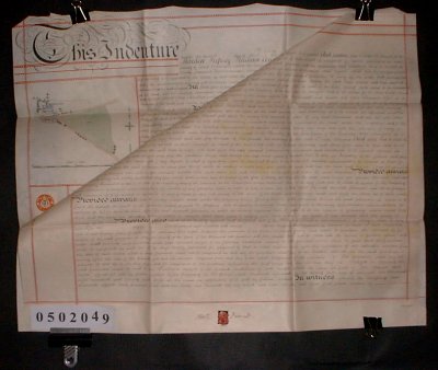 | Parchment : 2 sheets 68cm x 55cm with wax seal and signature of Thomas Dowsett. Embossed Stamp. Plan of property. | ||||||||||||