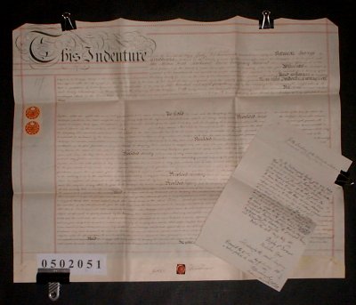 | Parchment : 1 sheet 70cm x 55cm with wax seal, signature and revenue stamp. Receipt signed by George Woodhams on back. Attached handwritten letter addressed to Woolwich Modern Perm Building society dated 21 July 1881. | |||||||||||