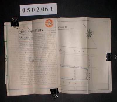 | Parchment : 7 sheets closely written on all sides, wax seal, signature and revenue stamps. Scale plan of property. | ||||||||||||