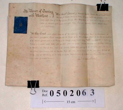 Edward CARLETON of West Tarring, Sussex. Esquire. James CARTER of West Tarring, Sussex. Esquire. William HIDE of West Tarring, Sussex. Carpenter. SUBJECT This is a Court Document of the Manor of Tarring with Marlpost, Sussex, of which Edward Carleton is the Steward. James Carter is surrendering copyhold property to the Lord of the Manor and to the use and behoof of William Hide. the property is a messuage called 'Bolds' adjoining the Townfield Gates, containing 1 rood of land. The price is £315 (which seems a very high price for such a small plot!). | |||||||||||