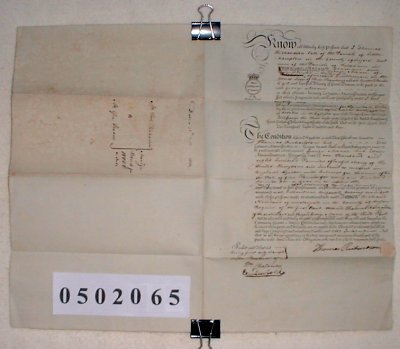 | Paper : 2 sheets 34cm x 21cm (written on one side only) signed and embossed revenue stamp. | ||||||||||||
