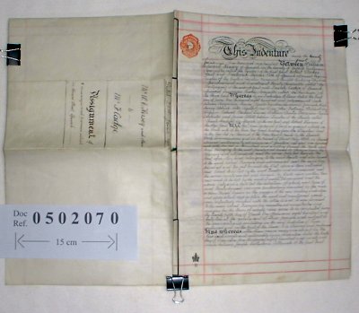 | Parchment : 3 sheets 40cm x 26cm (written on 4 sides) with 4 wax seals and revenue stamp. | |||||||||||||