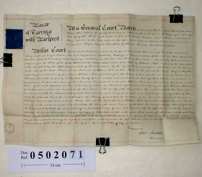 Edward BARKER of Tarring, Sussex. Esquire. Charles MARSHALL of Tarring, Sussex. Gentleman. William TRIBE of Worthing, Sussex. Gentleman. William STREET (deceased) of Goring, Sussex. Yeoman. SUBJECT The document concerns a copyhold tenement called Bolds in the Manor of Tarring with Marlpost. It contains 1 rood of land, adjoins the Town Field, and includes a cottage lately erected by William Hide. We are told that a previous proclamation had been made by the Manor Court for any to claim this property, and William Tribe is now doing so. He is acting as the Executor of William Street and claims that William Hide borrowed £352/17/4d from William Street in 1810 on the security of this property. William Hide later defaulted on the loan. Accordingly, William Tribe is now being admitted to the property. Edward Barker is Lord of the Manor and the document is signed by Charles Marshall, as steward of the manor. | |||||||||||