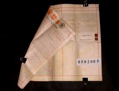 | Parchment : 4 pages 29cm x 46cm with 2 wax seals and signatures. Revenue stamps. | |||||||||||||