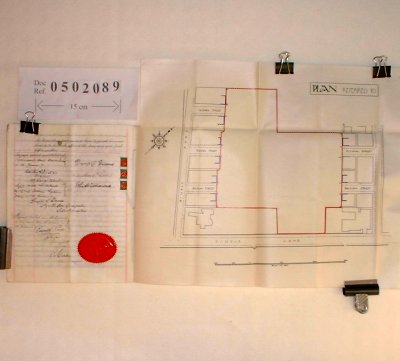| Parchment : 22cm x 28cm 4 Sheets 3 Wax Seals and Signatures, Duty Stamps. There is a large scaled plan of the property. | ||||||||||||