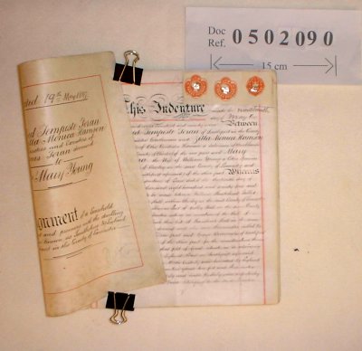 | Parchment : 22cm x 28cm 7 pages and back cover. 3 wax seals, signatures and Revenue Stamps. | ||||||||||||