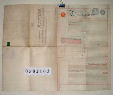 | Parchment : 2 sheets 30cm x 46cm, small plan of property on front page. Wax seal and signature, revenue stamp. Schedule. | ||||||||||||