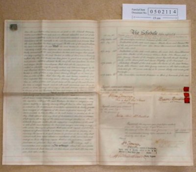 | Parchment : 2 sheets 47cm x 30cm with 2 wax seals and revenue stamp. | |||||||||||