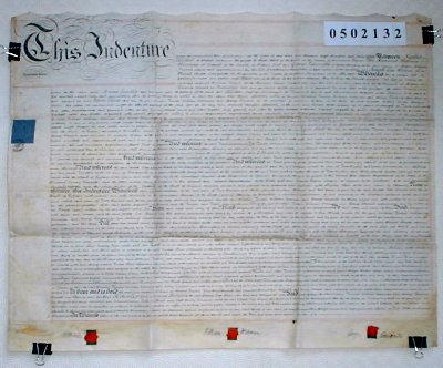 | Parchment : 1 sheet 75cm x 58cm with 3 wax seals and revenue stamp. Plan of property on the reverse. | |||||||||||