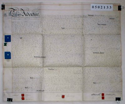 | Parchment : 1 sheet 75cm x 63cm with 5 wax seals and signatures and embossed stamps. | |||||||||||