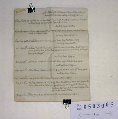 Thomas Matthewman of Shelley, Yorkshire. Sarah Grice of Sandall cum Magna, Yorkshire. Spinster. Eleanor Grice of Sandall cum Magna, Yorkshire. Spinster. Elizabeth Grice of Sandall cum Magna, Yorkshire. Spinster. SUBJECT The title written on the document is 'A Schedule of the title Deeds of Mr Thomas Matthewman touching a Freehold Estate of his situate in Shelley in the County of Yorkshire'. The Schedule begins with an Indenture in the 19th year of Queen Elizabeth and lists a total of 25 indentures with grants of probate etc up to 1784. The property came into the Matthewman family in 1733. The final deed is an Indenture of Demise in 1784 between Thomas Matthewman and 3 spinsters, Sarah, Eleanor and Elizabeth Grice of Sandall cum Magna, Yorkshire. This appears to be in respect of a loan of £1,000 from the Grice family. The document appears to be an original dated 24/05/1784 with original signatures by the 3 Misses Grice acknowledging receipt of the deeds listed, and witnessed by John Grice. | ||||||||||||