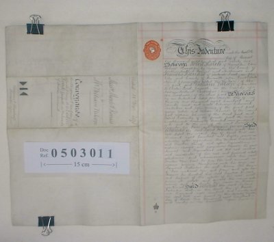 | Parchment : 25cm x 40cm 2 pages with 2 wax seals and revenue stamps. 2 signatures. | |||||||||||||