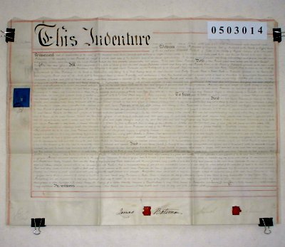 | Parchment : 1 sheet 51cm x 66cm with 2 wax seals, revenue stamp, and a small plan of the property on the back. | |||||||||||||