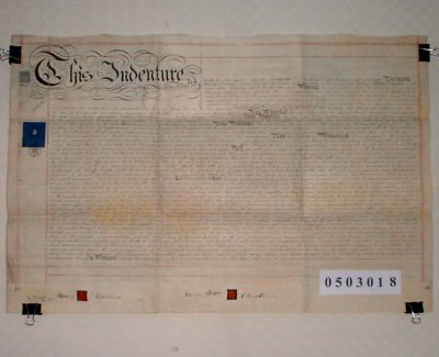 | Parchment : 1 sheet with 2 wax seals and revenue stamps. Includes a second Indenture of 1875 written on the back. | |||||||||||