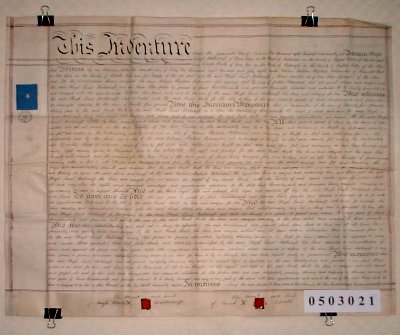| Parchment : 1 sheet 72cm x 59cm with 2 wax seals, the marks X of the two signatories, and revenue stamps | |||||||||||||