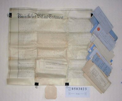 | This is a bundle of over 50 documents. The principal item is a copy of a will on a single sheet of parchment, 54cm x 71cm, with grant of probate and embossed pendant seal attached. All other documents are paper ranging from small receipts upwards. | |||||||||||
